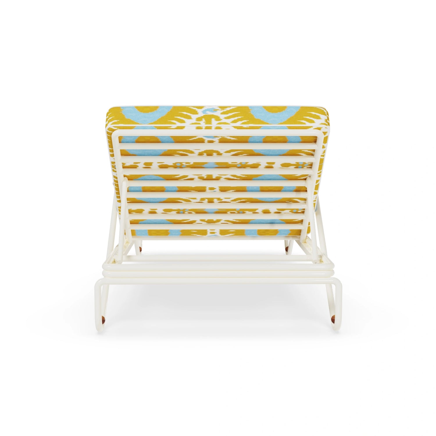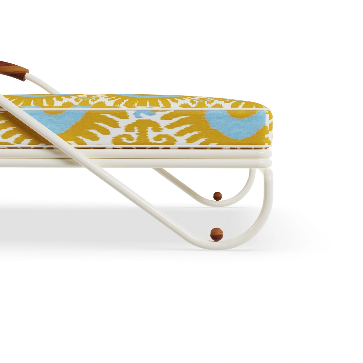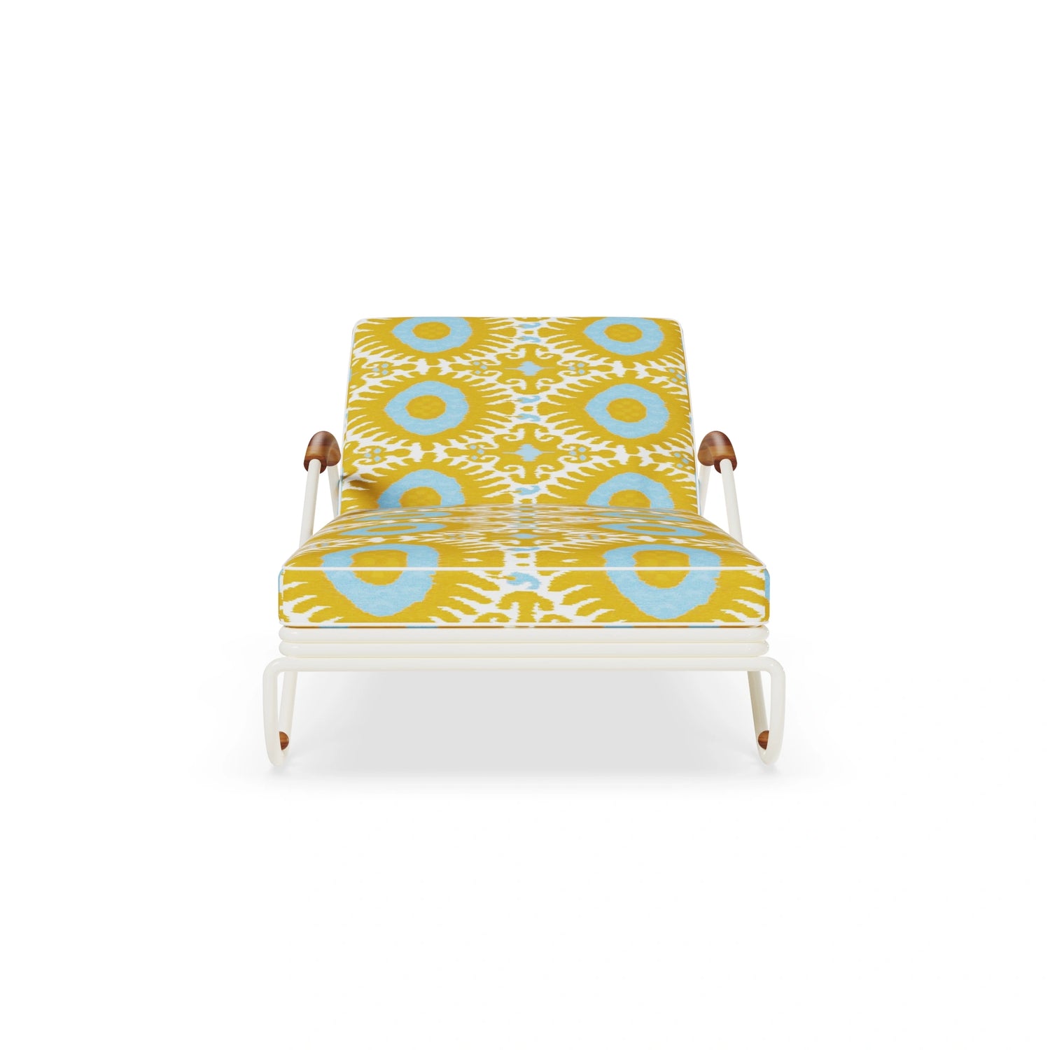 The Savona Sunbed embodies the spirit of luxury outdoor design — elegant, versatile, and crafted with precision. Handcrafted in lacquered metal, its sleek structure is accented with Iroko wood decorative details that add warmth and sophistication. The adjustable backrest offers customizable comfort, inviting long hours of relaxation under the sun. Dressed in a vibrant Ikat-patterned fabric, this piece celebrates Mediterranean artistry through color, texture, and craftsmanship. The Savona Sunbed is where refined design meets leisurely comfort, making it a perfect statement for terraces, poolside retreats, or coastal villas.