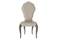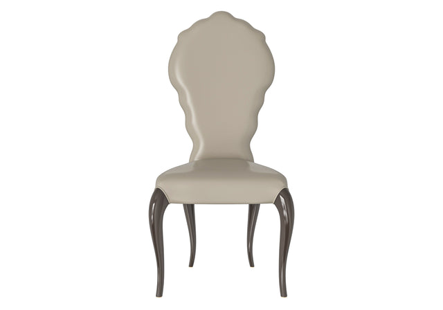 A statement piece by Modenese Luxury Furniture with a uniquely sculpted backrest and taupe leather upholstery. The dark curved legs bring a classic charm, blending artful design with comfort.