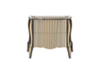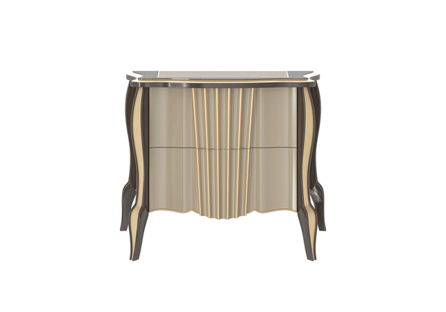 A stunning nightstand with a sculptural design by Modenese Luxury Furniture, featuring fluted panels and curved edges. The contrasting beige and dark tones bring sophistication, while its elegant legs add a touch of luxury to any bedroom.