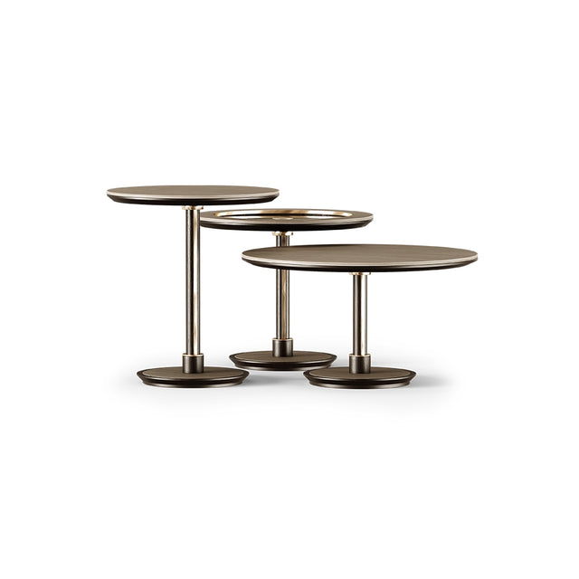 Three center tables, different in height, contrast each other to give the living room a more appealing look. The Sister center tables feature a delicate play between wood and brass, where the materials take shape in elegant silhouettes, emphasizing its pure characteristics.