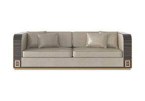 This elegant sofa by Modenese Luxury Furniture combines contemporary design with luxury. The geometric wooden base adds a modern touch, while the plush cushions ensure a comfortable seating experience. The neutral tones and clean lines make it a perfect fit for modern living rooms, blending sophistication and comfort seamlessly.