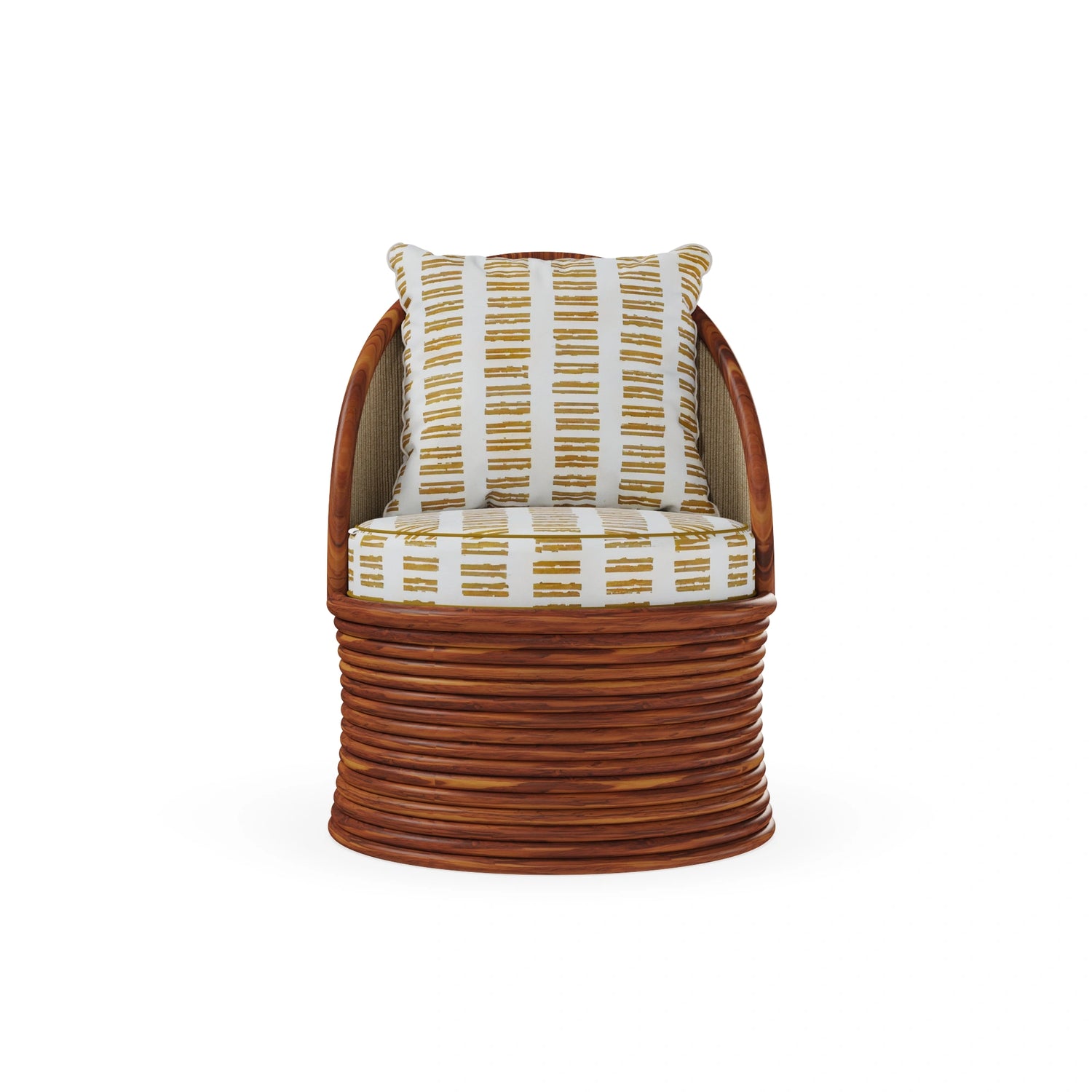The Smeralda Armchair embodies Mediterranean elegance with a boho vintage-inspired design. Crafted in iroko wood, it is highly durable and ideal for outdoor use. Featuring a synthetic jute backrest and plush back and seat cushions with a Mediterranean decorative pattern, it ensures both comfort and style. With its artisanal detailing and timeless charm, the Smeralda adds a unique character to any lounge space, making it a true statement of outdoor luxury furniture.
