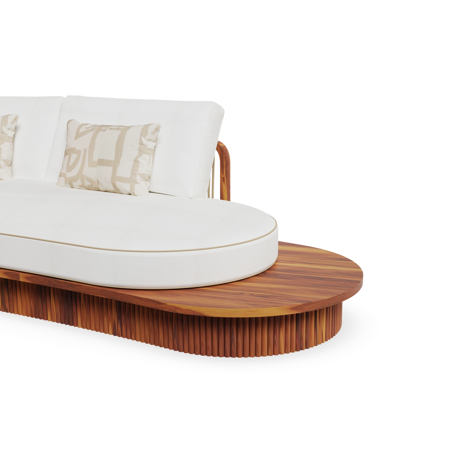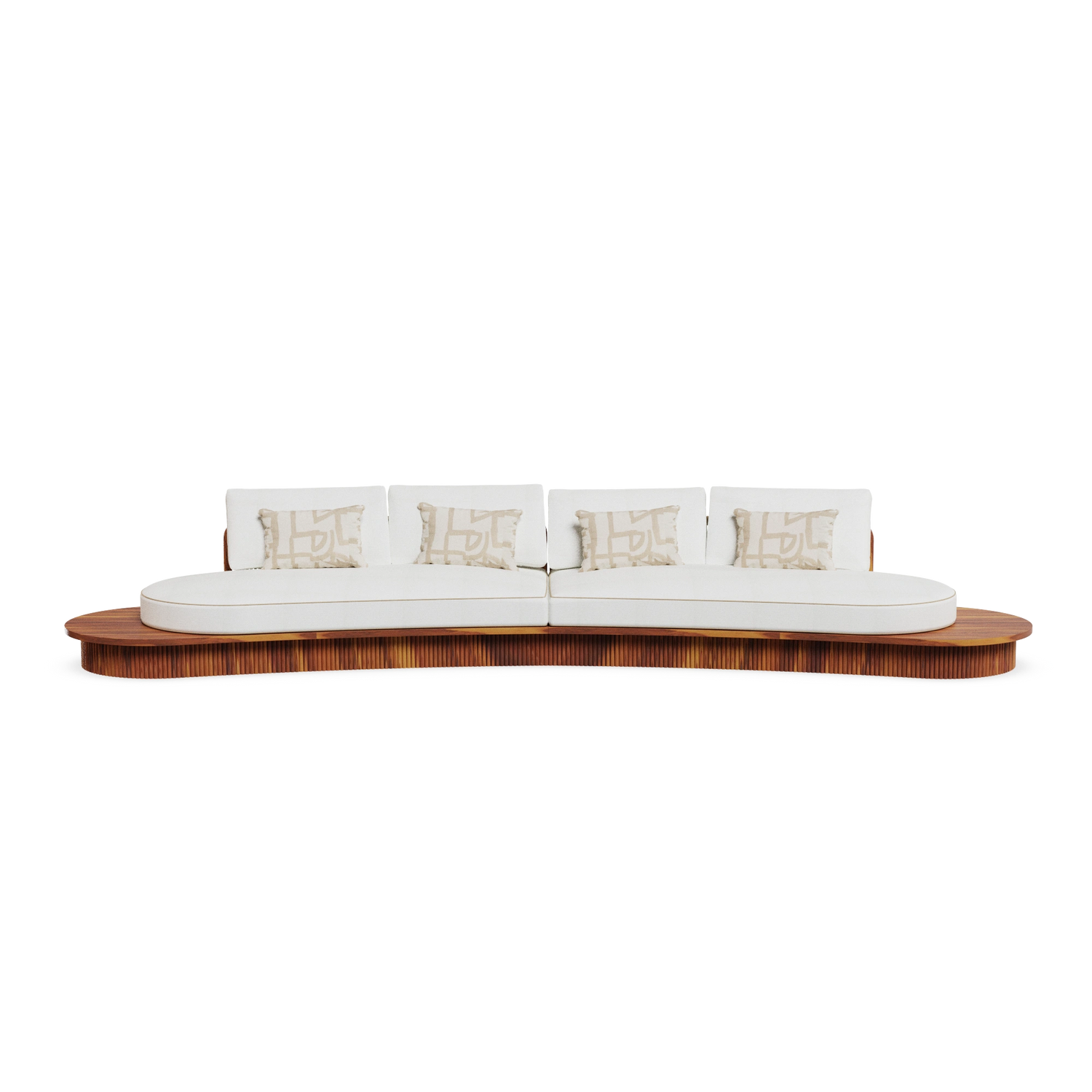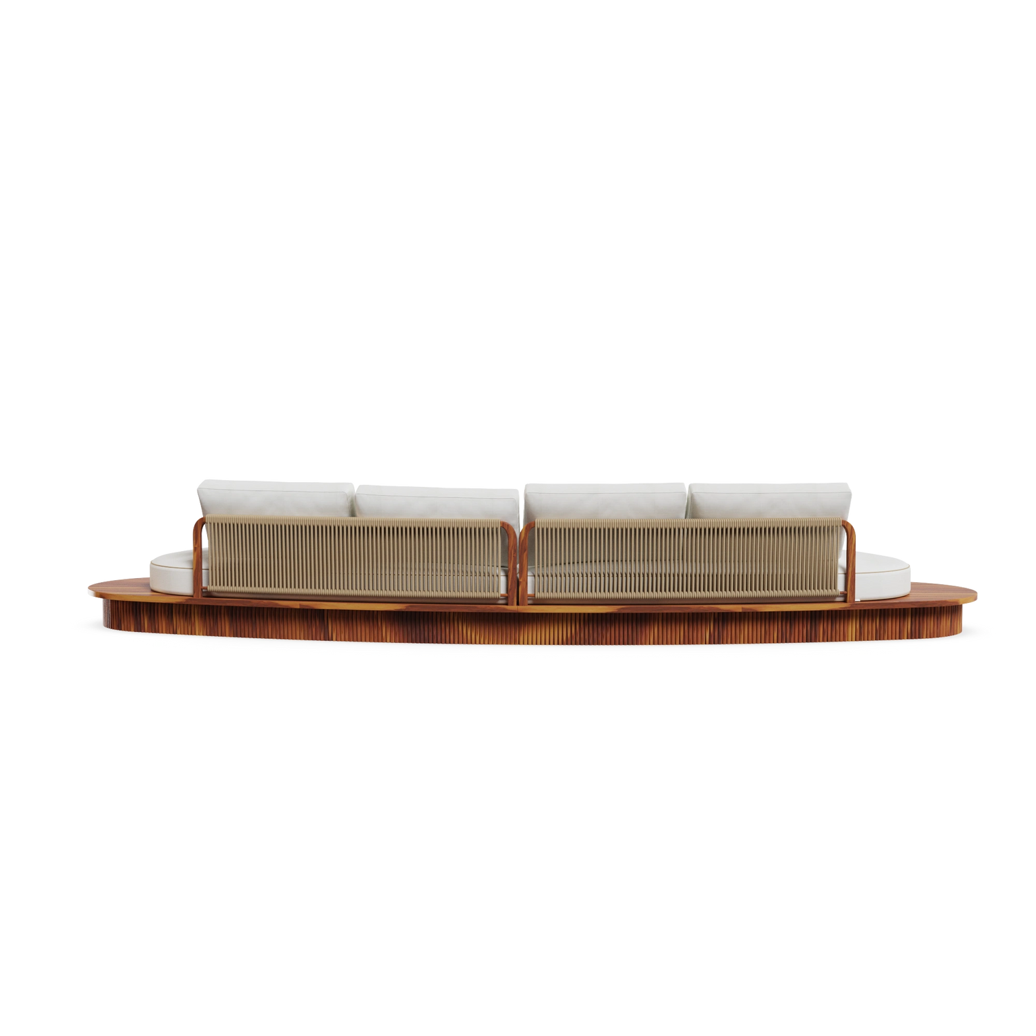 The Sorrento Sofa is a statement of elegance and craftsmanship, hand-crafted in durable iroko wood and designed to elevate any outdoor setting. Its organic silhouette flows naturally, while the ribbed base detail adds depth and sophistication. The carefully designed back features refined cord elements, showcasing meticulous attention to detail.Complete with generously padded back and seat cushions, the Sorrento Sofa ensures exceptional comfort.