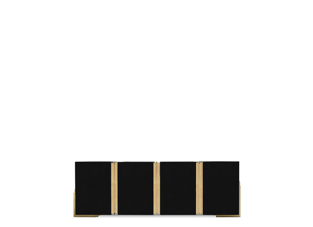 Designed to command attention, the Tenor Sideboard showcases a sleek and sophisticated aesthetic that elevates any space. Its clean lines and black lacquer finish exude timeless elegance, while the textured surface adds a touch of modernity. With ample storage space and a polished brass frame, this sideboard combines functionality and luxury in perfect harmony. A statement piece for those with a discerning eye for exquisite design.