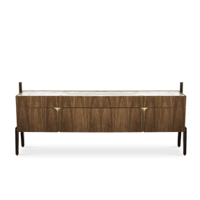 These same curvilinear lines are found in the sophisticated design of the Vittorio sideboard, named after the great Vittorio Gassman. The combination of the wooden body and H shaped legs with golden handles, recall the lines of a blooming flower. The recessed top of this unique sideboard is also handcrafted in marble for an extra touch of luxury.
