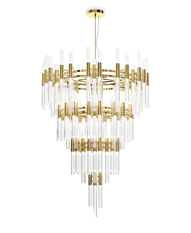 The Waterfall Chandelier is made with the best handmade techniques and high-quality materials, such as gold-plated brass and crystal glass. A luxury chandelier with elegant shapes of fine tubes of crystal glass and extraordinary circular levels that provide a sensation of waterfalls. Its design is an ode to luxury and will make a statement in a modern lounge area or a luxury lobby.