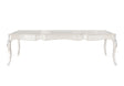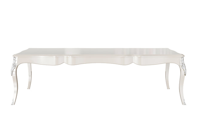 A beautifully crafted white dining table by Modenese Luxury Furniture featuring intricate carved details and softly curved edges. The elegant cabriole legs add a touch of classic sophistication, perfect for formal dining settings.