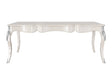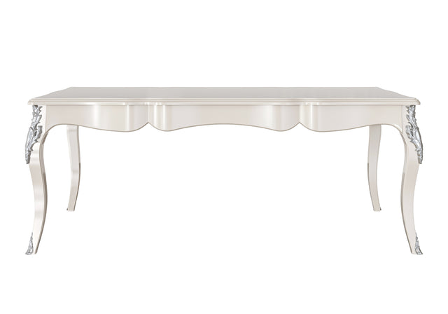 This rectangular table by Modenese Luxury Furniture showcases a white glossy finish with delicately carved floral accents on the corners. The flowing edges and gracefully curved legs enhance its timeless elegance, ideal for traditional interiors.