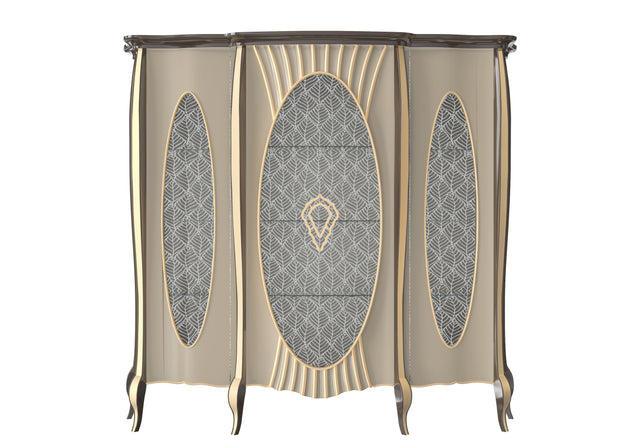A striking wide cabinet designed by Modenese Luxury Furniture with fluted panels and three oval glass fronts. The decorative patterns and curved wooden legs bring elegance and charm, making it a perfect statement piece for dining rooms or grand living spaces.