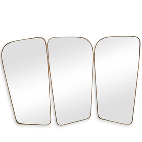 A beautifully designed vanity wall mirror. It features three panels and an irregular shape with a golden strap of plated brass that evokes a mid-century modern style. It can be hung above a sideboard or a console and still give that retro look to your bedroom or living room.