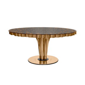 You won't be able to resist the Wormley Dining Table, perfect for the engineering minds, featuring a skillful structure made of pipe rings, a hallmark of excellence in metalwork that supports a clear glass on the top. Some pipes are then cut vertically to form a leg, standing on a circular mirrored base produced in metal.