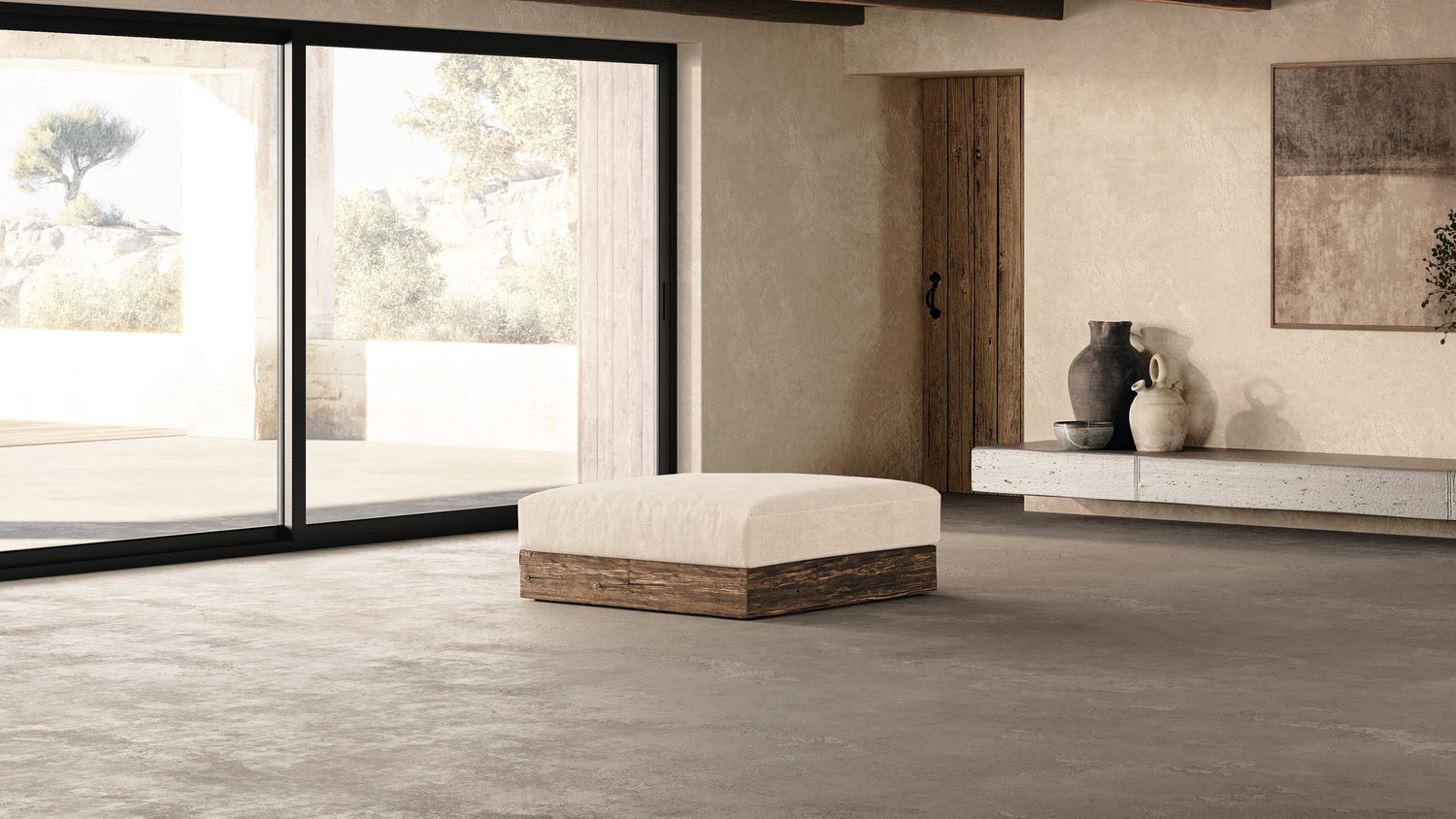 Modular indoor sofa crafted with reclaimed oak beams.